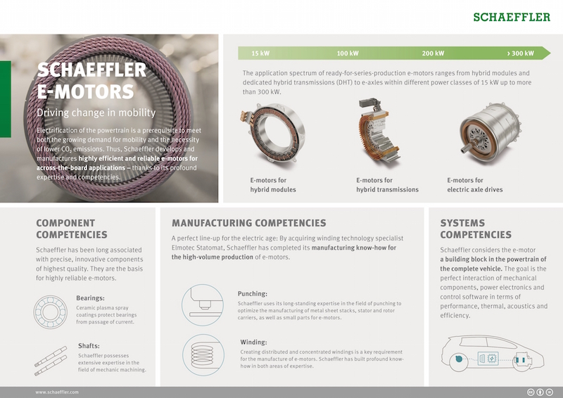 Schaeffler входит в сектор производства электродвигателей с модульной, высокоинтегрированной технологической платформой. Это семейство электрических двигателей имеет высокий КПД и соотношение цена/производительность. Потенциальные применения — гибридные модули, трансмиссии (DHTs) и электроприводы. Напряжение в диапазоне от 48 В до 800 В, мощность от 15 кВт до более чем 300 кВт. Объем производства для ряда проектов клиентов по всему миру должен начаться в 2021 году. Для организации и эксплуатации производственных линий будет использоваться всемирная сеть производственных предприятий Schaeffler, а также предприятия по производству специального оборудования и инструментов. Schaeffler будет публично представлять электродвигатели, которые были разработаны собственными силами и готовы к серийному производству, в качестве полных систем впервые на IAA.